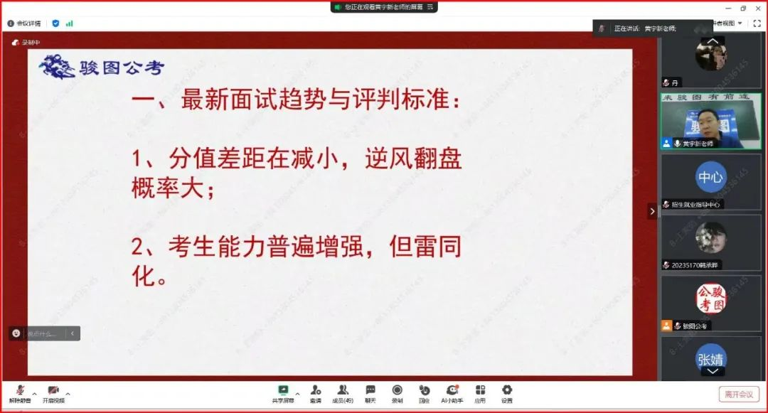 同时,黄老师通过面试真题的实例分析,向学生解析了考题的答题要点和注意事项,让学生们对面试的答题技巧和思路有了更深刻的理解。最后,黄老师进行答疑解惑,并表达了对同学们的殷切期望与美好祝愿。