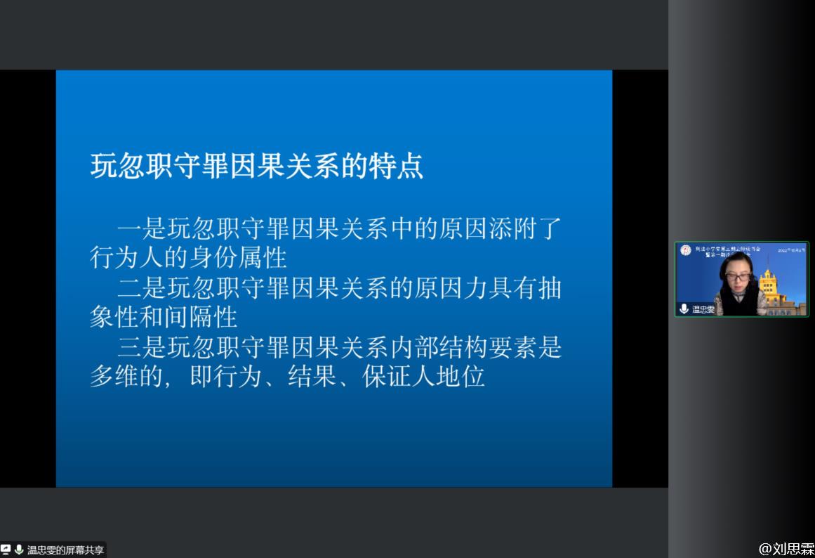 2021级刑法学博士温忠雯就个人论文《玩忽职守罪因果关系研究》进行观点展示。分别从研究玩忽职守罪因果关系问题的原因、实践中玩忽职守罪因果关系的疑难问题、玩忽职守罪因果关系的整合进路等方面展开,并以哈尔滨市“韩某甲、杨某、郭某甲等11人玩忽职守案”等作为典型案例进行分享。提出正视“条件说”的适用困境、重视类型化思维的实践意义、探索客观归责理论的应用前景三条进路,运用客观归责理论操作演练,关注客观归责方法论维度的价值,为司法实践办案提供方法参考。