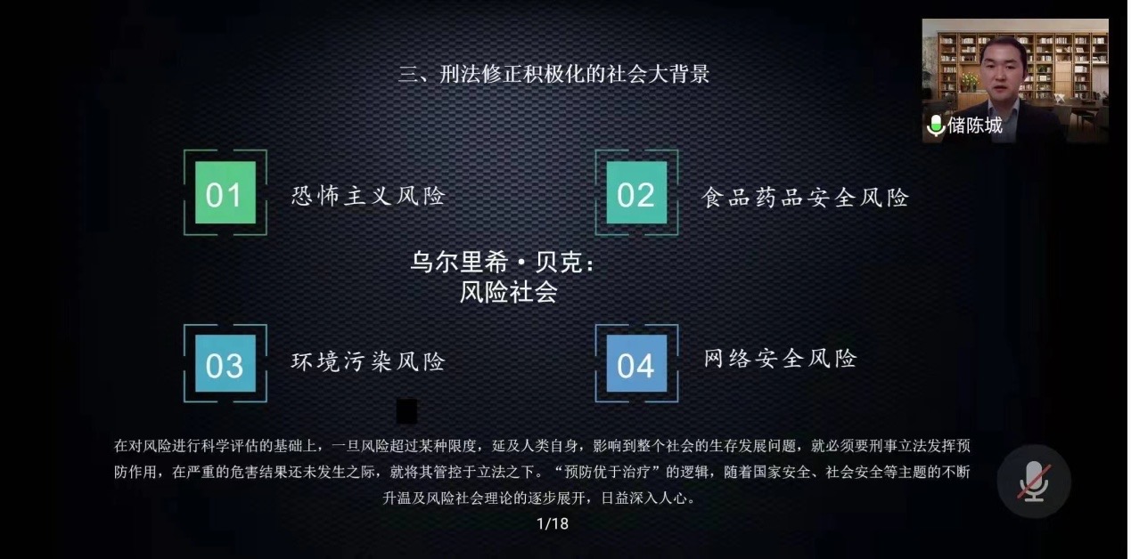 储陈诚老师则对积极刑法立法下的刑事辩护的应对提出了看法。储老师首先提到了刑事立法的扩张主要体现在刑法对法益保护的早期化以及刑法对法益保护的抽象化两方面。其次,还解释了积极刑法立法的原因,主要是风险社会的问题。同时,还提到了积极刑法立法与消极刑法立法的对峙,积极立法强调预防主义,消极立法强调实效主义。最后,老师强调了应对刑法修正案的辩护困境和机遇。