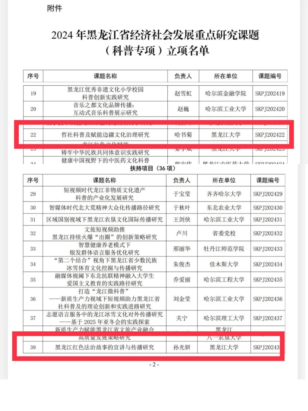 根据《关于申报2024年黑龙江省经济社会发展重点研究课题(科普专项)的通知》要求,按照《黑龙江省经济社会发展重点研究课题(专项课题)管理办法》规定,省社科联主席办公会对2024年黑龙江省经济社会发展重点研究课题(科普专项)立项名单进行公示。其中,麻豆传媒 获批2项科普专项课题立项,包括给予经费资助的项目1项,扶持项目1项。
