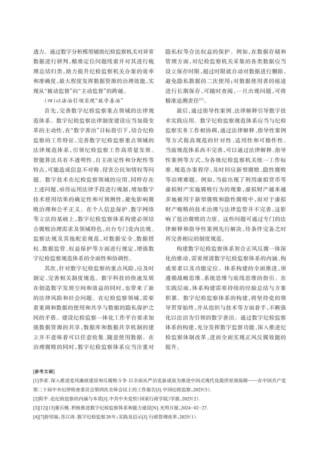 数字纪检监察是数字技术与纪检监察工作的深度融合,是贯通全流程、全要素的新型监督模式。文章创新性地提出以战略思维、系统思维、底线思维指引体系建设,强调实现价值理性与技术理性的同构。在构建路径上,主张建立“纵横结合”的组织体系,通过纪检监察一体化工作平台建设,破解“数据孤岛”问题。文中还特别关注了“算法黑箱”、数据安全等风险防范,提出以法治引领实现“数字善治”。该文通过对四川省成都市金牛区、浙江省绍兴市等地方实践的分析,为构建数字纪检监察体系提供了兼具理论深度与实践价值的参考,对推进纪检监察体制改革具有重要意义。