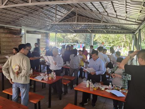 活动伊始,老师们以“牢记嘱托、感恩奋进”庆祝中华人民共和国成立75周年大合唱比赛为契机,特别邀请校合唱团的两位同学作为专业指导,带领老师们练习大合唱曲目——《爱我中华》和《如愿》,随着音乐慢慢响起,植物园里也传来老师们悠扬的歌声。