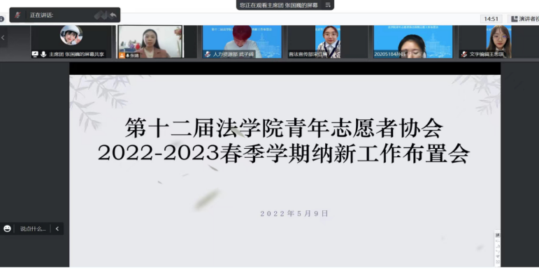 青年志愿者协会于线上开展了2022-2023春季学期纳新工作布置会。本次会议由法青协主席张国巍主持。