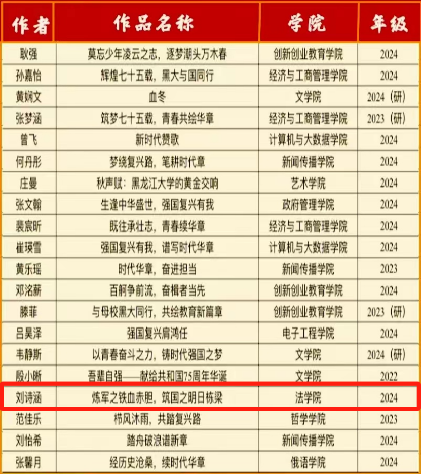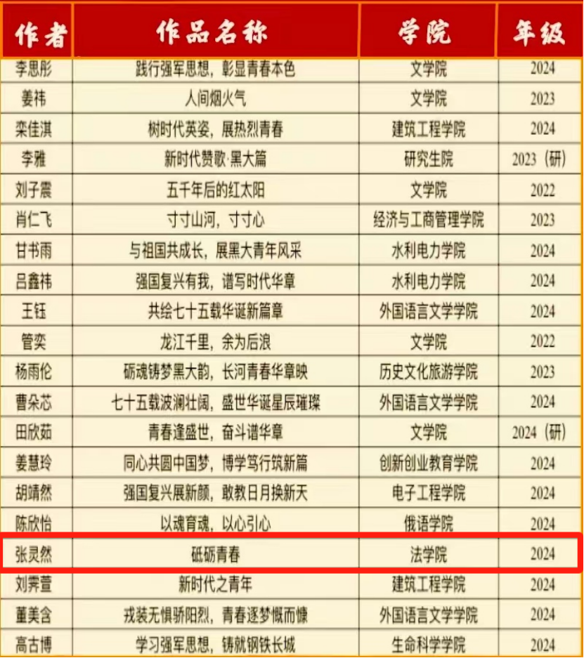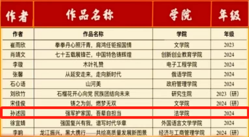 积极组织学生参加“强国复兴有我 谱写时代华章”庆祝中华人民共和国成立75周年主题征文比赛。法学学子以笔为犁,深厚的人文底蕴和炽热的爱国情怀跃然纸上,总计5篇作品在全校23个学院共作品1300余篇中脱颖而出,其中,孙述园一篇获得一等奖,刘诗涵一篇获得二等奖,曲珈莹、宫豪骏各一篇获得三等奖,张灵然一篇获得优秀奖。祝贺获奖同学,希望未来麻豆传媒