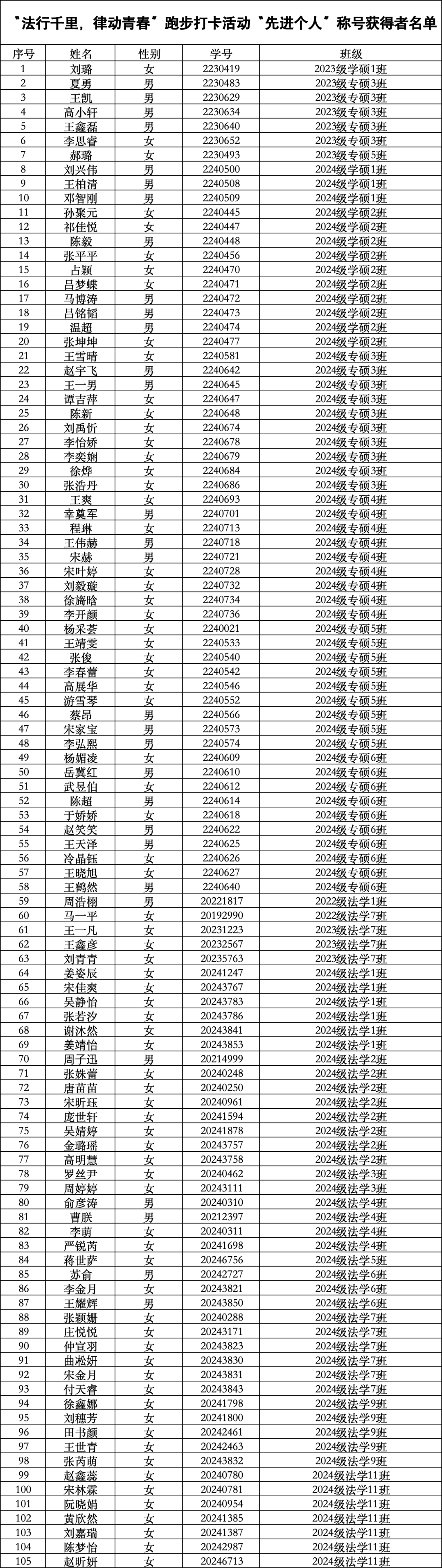现将“法行千里,律动青春”跑步打卡活动“先进个人”称号获得者名单公示如下: