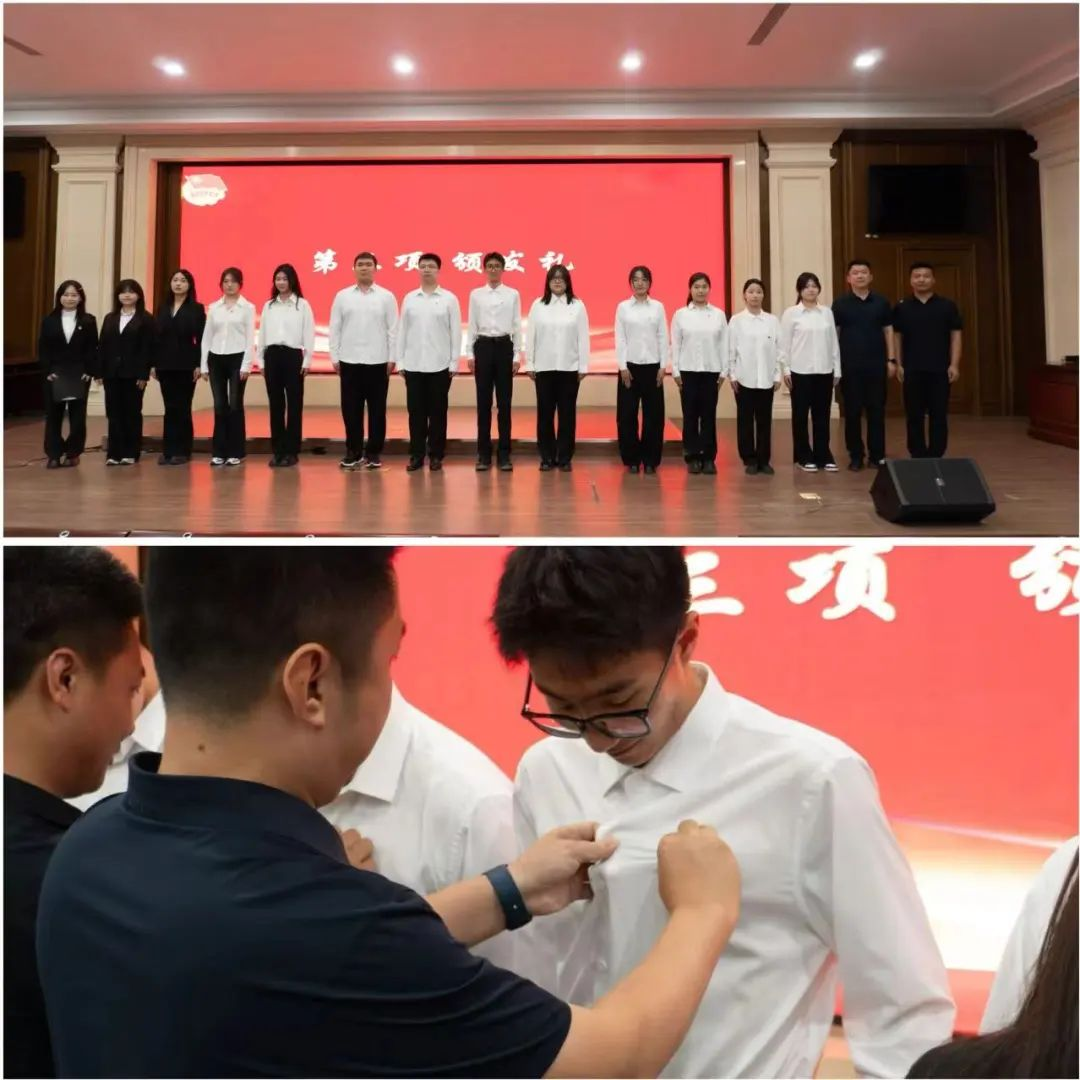 学院团委学生副书记栾天宣读新团员名单,文浩然老师和王业超老师为每位新团员颁发团徽和团员证。当金灿灿的团徽佩戴在胸前,新团员们神情庄重,眼中闪烁着坚定的光芒,正式成为共青团的新生力量。
