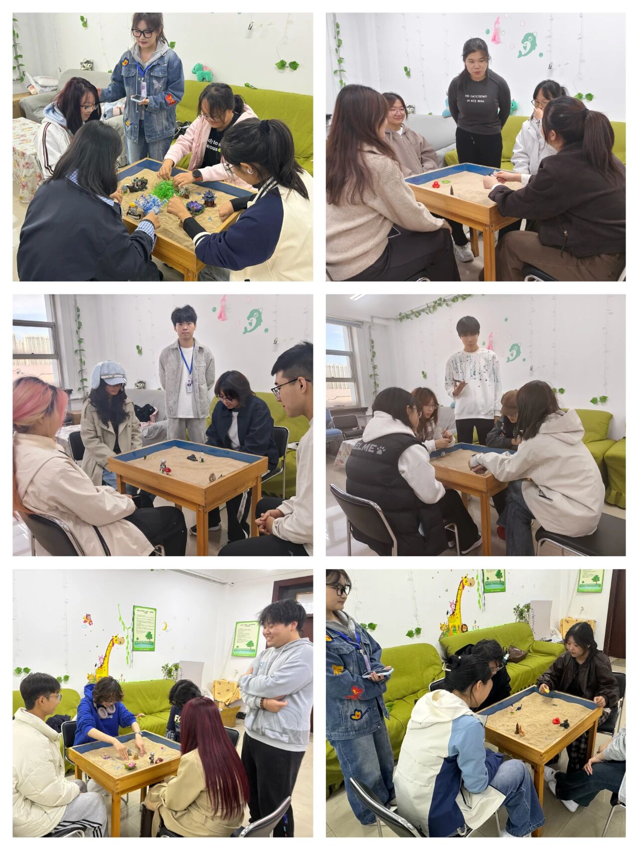 活动开场,主持人在温馨的自我介绍中与同学们建立信任,营造出安全、包容的交流氛围。在随后的沙盘体验环节,同学们自由漫步于陈列架前,从丰富多样的沙具中挑选与内心共鸣的意象——无论是象征成长的小树、代表安宁的屋舍,还是充满想象的奇幻角色,每一件都成为情感表达的特殊载体。沙具被置于沙盘之中的过程,也是大家心灵图景的逐步构建,是独特的心理表达。每一次选择与摆放,不仅是创意的呈现,更是对情绪状态的觉察与生命故事的温柔梳理,是心灵的有效呈现。