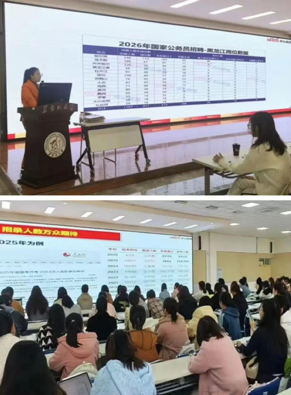 张岩芳老师首先带领同学们速览了2026年度国考公告要点,包括招录人数、报考年龄、政治素养考察等。她还梳理了报名、资格审查、准考证打印及笔试等关键时间节点,提醒同学们把握报考节奏。此外,张老师详细分析了行政职业能力测验与申论的备考重点及学习方法。最后,她重点分享了科学有效的选岗策略,并进行个性化答疑,现场指导学生如何匹配岗位以提升上岸几率。现场气氛热烈,同学们纷纷表示在本次讲座中收获颇丰。