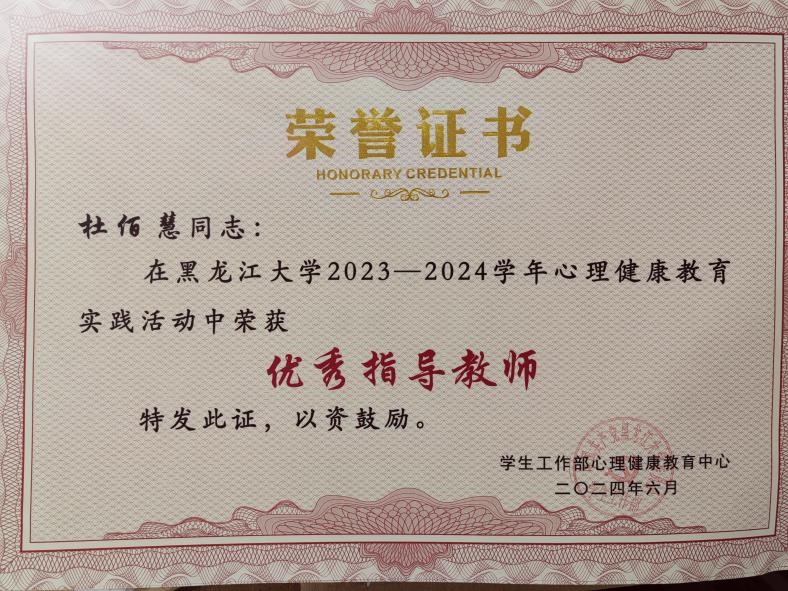 教师精心指导学生参加各类心理健康教育比赛,助力学生成长成才。其中,杜佰慧老师荣获2023-2024学年心理健康教育实践活动“优秀指导教师”、第四届“心沐阳光,手绘心语”心理手语操大赛“优秀指导教师”,王业超老师荣获“朋辈护航,青春同行”十佳心理委员风采大赛“优秀指导教师”称号。