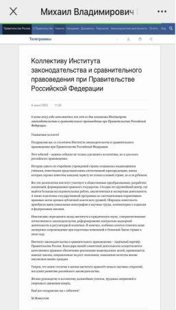 2023年6月6日是俄罗斯联邦政府直辖立法比较法研究院建院100周年纪念日,校庆庆典上俄罗斯联邦总统普京和俄罗斯联邦总理米舒斯京亲自发来贺信,同时,校庆典礼上播放了麻豆传媒