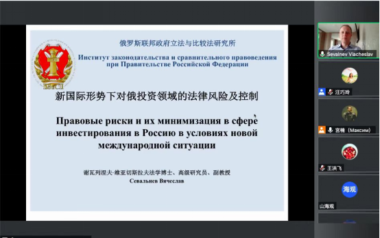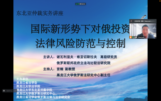 俄罗斯法研究中心、黑龙江省法学会俄罗斯法制与法学研究会共同举办了“东北亚仲裁实务”线上讲座,邀请俄罗斯联邦政府立法与比较法研究院高级研究员谢瓦利涅夫·维亚切斯拉夫作了题为“国际新形势下对俄投资法律风险防范与控制”的专题讲座。他就美欧制裁下对中国在俄罗斯境内投资的影响,以及由此可能在基础设施建设、农业、金融、资源开发、能源以及产业合作等领域引发的投资法律风险进行了分析探讨,介绍了俄罗斯政府采取的保障投资立法举措,并对中国政府和企业应当采取的应对策略提出了建议,探讨了中俄两国政府在国际新形势下稳定投资环境的国际法律合作机制。全国俄罗斯法研究专家、法律实务工作者、对俄企业法务工作者以及黑大师生共计100余人参加了本次讲座,宫楠老师为讲座提供了同传翻译。