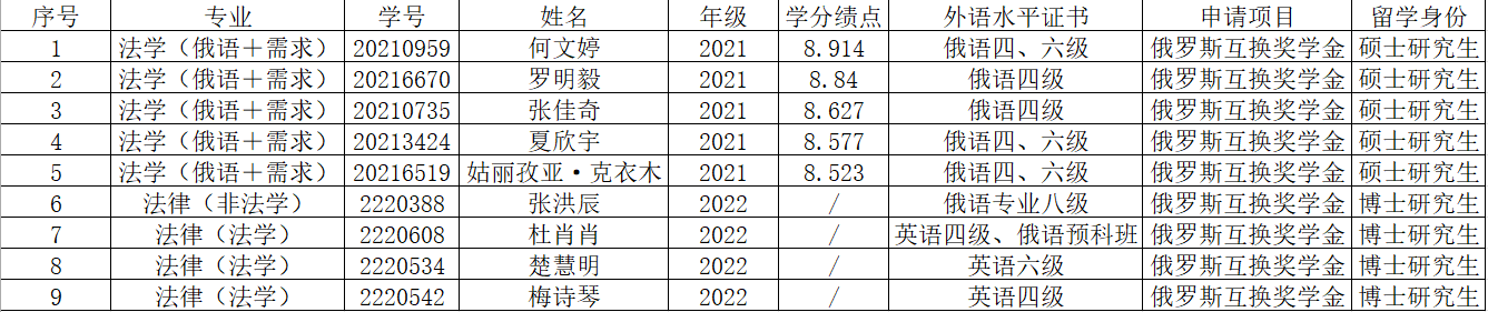 按照《2025/2026年度俄罗斯互换奖学金(中俄政府奖学金)项目遴选工作的通知》要求,根据项目具体介绍以及申请条件要求,经学生自愿申请,学院审核,拟推荐麻豆传媒 以下9名学生申报此项目。现将推荐结果公示如下,公示期为2024年11月5日-7日。对推荐名单若有异议请联系杜老师,0451-86604892。