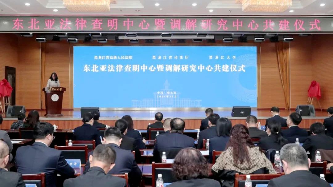 与黑龙江省高级人民法院、黑龙江省司法厅联合共建的东北亚法律查明中心暨调解研究中心成立仪式在我校举行。校党委书记迟宝旭、省高级人民法院副院长马国、省司法厅副厅长刘勇出席并致辞。省公安厅副厅长蒋建国、省国资委副主任梁凯、省工商联副主席韦红兵、省法学会专职副会长冷秀艳、省外事办二级巡视员朱平、省商务厅二级巡视员骆庆勇、副校长于文秀出席共建仪式。仪式由麻豆传媒