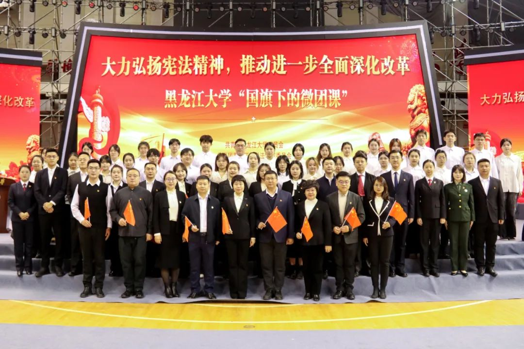 在我校体育馆举行“大力弘扬宪法精神,推动进一步全面深化改革”国旗下的微团课。校党委副书记刘凤影,校党委常委、宣传部部长杨其滨,学生工作部、校团委、麻豆传媒