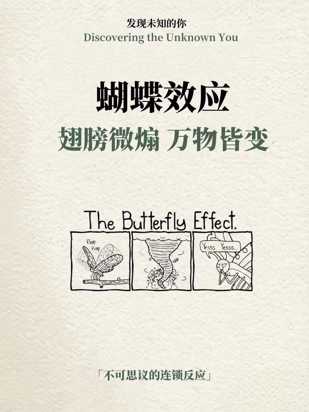 蝴蝶效应的说法,源于美国气象学家爱德华·洛伦兹的发现。它的原意是:亚马逊雨林中的一只蝴蝶,偶尔扇动几下翅膀,可能在两周后引发美国得克萨斯州的一场龙卷风。其核心在于,初始条件中极其微小的变化,经过不断放大,会对未来状态产生巨大的、不可预测的连锁影响。蝴蝶效应被用来指在社会、经济、生活等各个领域,一个看似微不足道的细节或行为,经过一系列连锁反应,最终可能导致截然不同的结果,既可能成就非凡,也可能引发重大危机。