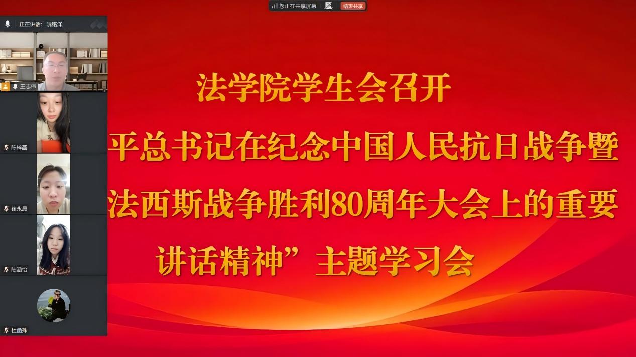 学子要立足法学专业特色,将抗战精神转化为维护公平正义、推进法治建设的实际行动;要勇担时代使命,在服务同学、奉献社会中践行初心,努力成长为担当民族复兴大任的时代新人。
