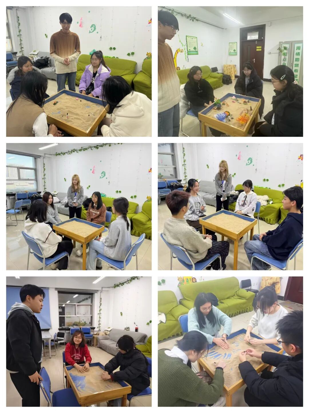 活动开篇,主持人带领同学们进行了自我介绍,搭建起信任桥梁,为同学们营造出安全松弛的互动氛围。随后,主持人为同学们简单介绍了沙盘活动,引导大家根据沙盘这一特殊载体,梳理纷乱思绪、释放心理负荷、重塑正向心态,对活动形成初步了解。接下来团体沙盘创作环节正式开启。同学们缓步流连于陈列着各类沙具的展架前,细细甄选与自身心境相契合的物件——这些沙具囊括人物、动物、建筑、自然景致等丰富的种类,每一件都蕴含着独特的象征寓意。选定之后,参与者轻轻将沙具置于沙盘之中,全神贯注地搭建专属心灵场景,以沙具倾诉内心深处难以言表的情愫。从沙具的精挑细选到摆放位置的反复斟酌,每一个细节都凝结着参与者当下的情绪流动,以及对过往经历的深度回溯和思考。